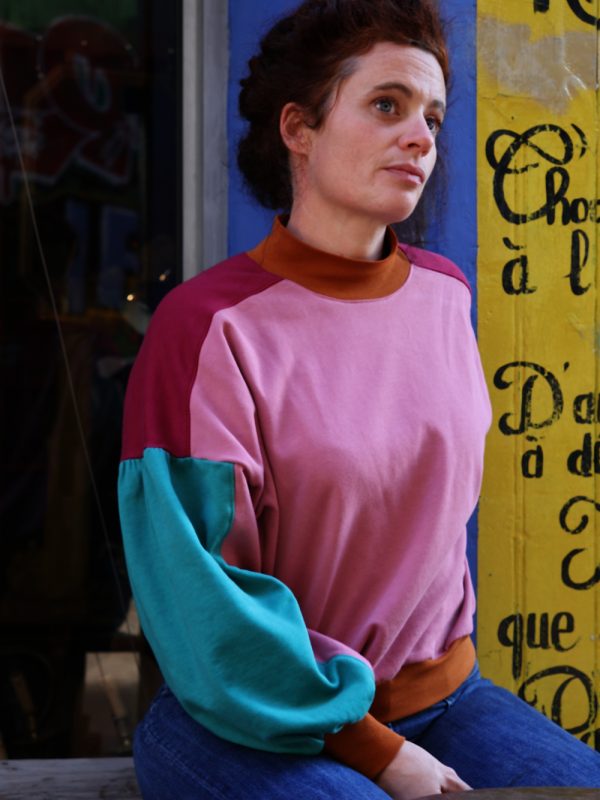 Twister est un patron de sweat offrant une multitude de possibilités. Les découpes devant/épaule, le col classique ou montant, les manches classiques ou droites… Il est possible de twister Twister à l’infini ! La version femme de Twister propose une coupe oversize, un col cheminée ou classique selon le look souhaité et une manche bouffante (optionnelle) à l’emmanchure très basse qui lui confère un look bohème chic très tendance.
