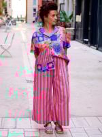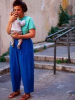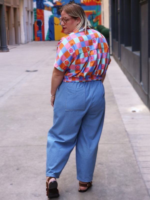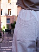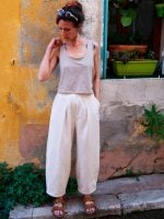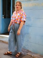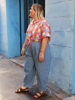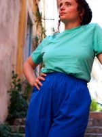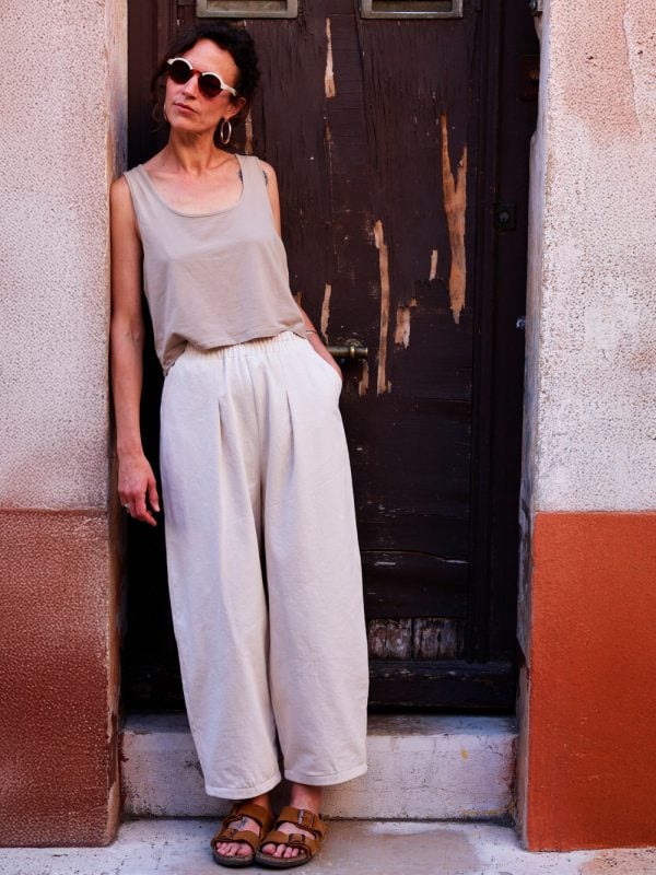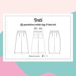 Inti est un patron de pantalon taille haute à ceinture élastiquée, facile à coudre et agréable à porter — parfait même pour les débutant·es. Il propose deux coupes : une version wide leg (longue ou 7/8e) pour un tombé fluide, et une version barrel 7/8e, resserrée en bas pour un joli volume ballon. Les grandes poches dos en V ajoutent une touche graphique. À associer avec la chemise Wayra pour un look complet !