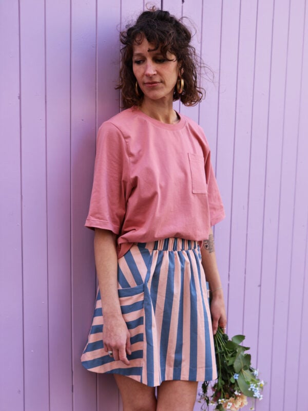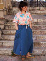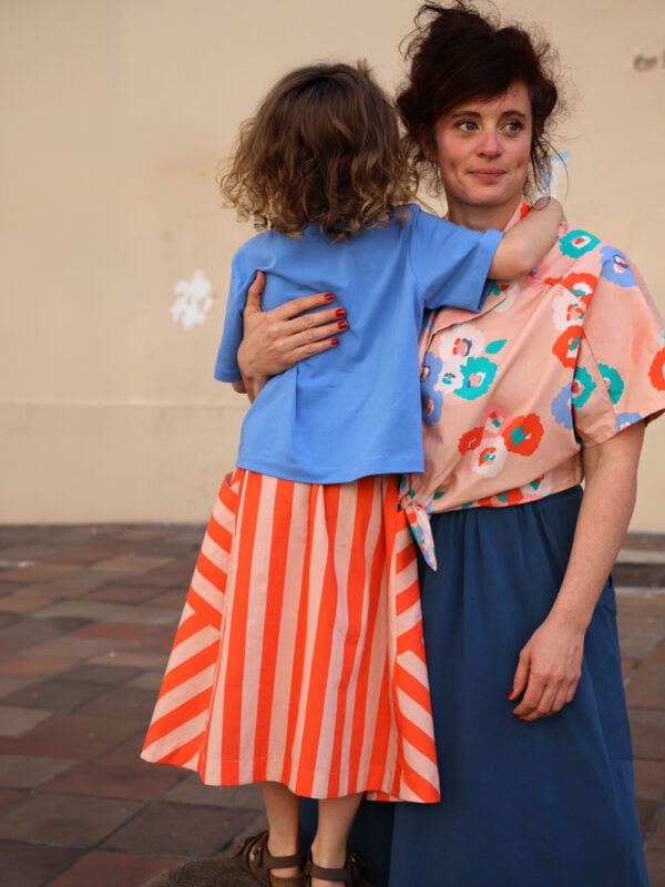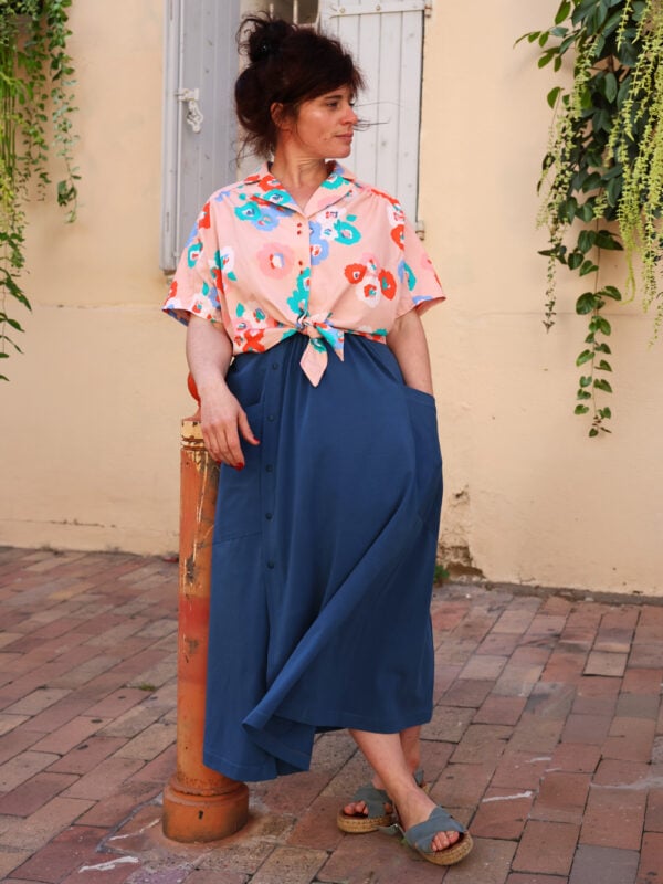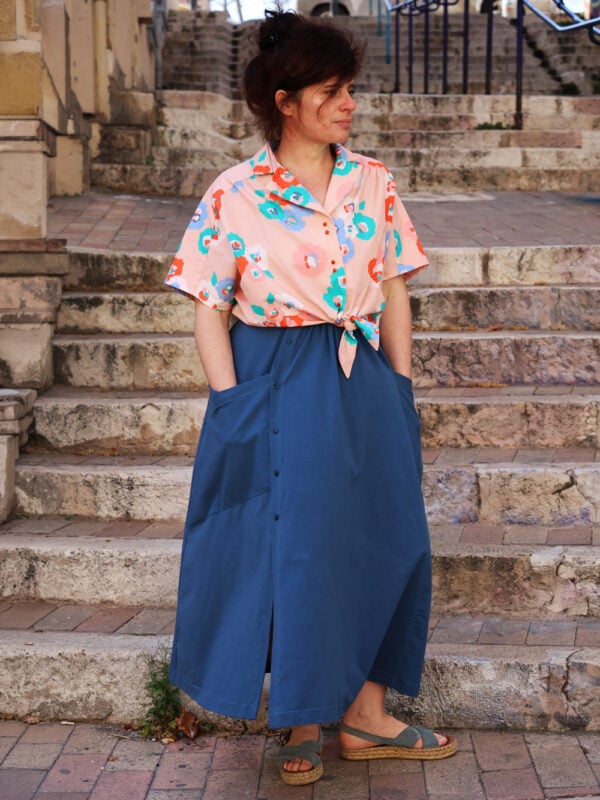 Le patron propose plusieurs options : jupe courte ou longue, avec ou sans poches côté, avec ou sans patte de boutonnage, pour varier facilement les versions. Origami peut être cousu aussi bien en maille qu’en chaîne et trame, grâce à des finitions adaptées, offrant ainsi encore plus de possibilités créatives. Accessible aux débutants, ce patron est parfait pour coudre une jupe confortable, personnalisable et pleine de caractère.