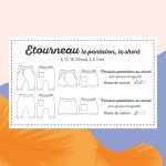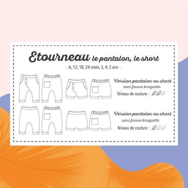 Etourneau est un patron de couture bébé et minis proposant plusieurs déclinaisons : une version pantalon et une version short à revers. Chaque modèle peut se réaliser au pli ou bien avec une fausse braguette et une incrustation courbe pour une véritable touche d’originalité. Vous pourrez également choisir d’ajouter de jolis détails comme les poches italiennes et/ou une poche dos plaquée.