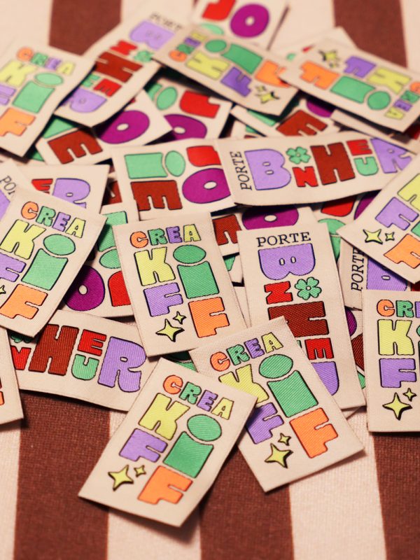 Découvrez les étiquettes tissées Happy Mood : Porte-Bonheur, Joie et Creakiff. Des étiquettes fun, colorées et faciles à coudre pour ajouter du pep’s et une touche positive à toutes vos créations handmade.